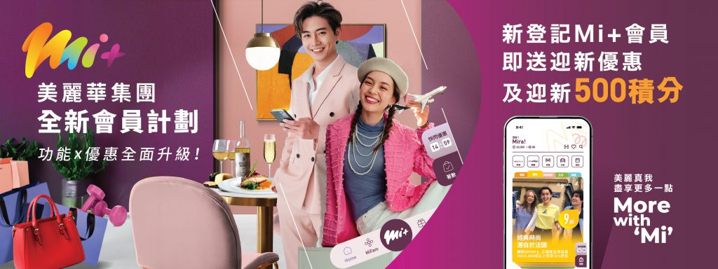 - Mi+ member offers are subject to change without prior notice. Please visit the Concierge or browse the Mira Place website (mira-mall.com.hk) or the Mi+ website (miplus.com.hk) for the latest information.
