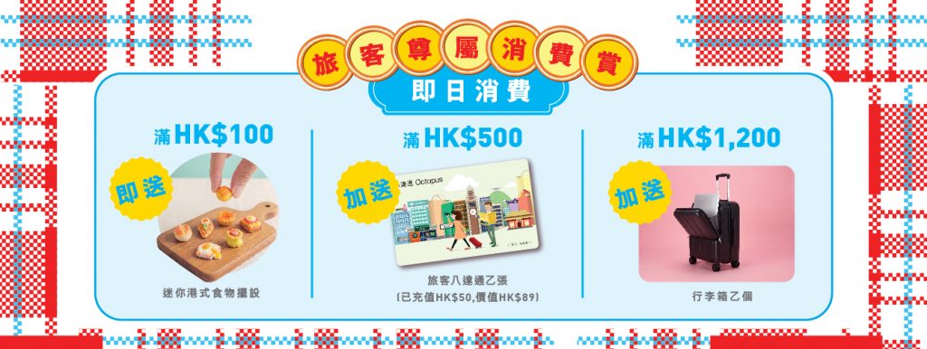 - 推廣期內,旅客於場內即日以電子消費滿HK$100(憑最多3組HK$100或以上之電子消費收據)並出示有效旅遊證件,即可獲贈迷你港式食物擺設乙個;即日以電子消費滿HK$500(憑最多3組HK$100或以上之電子消費收據),即可獲贈內含HK$50儲值額之旅客成人八達通卡乙張;即日以電子消費滿HK$1,200(憑最多3組HK$100或以上之電子消費收據),即可獲贈行李箱乙個。