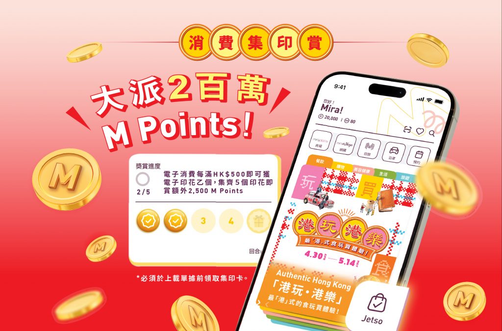 - 推廣期內,Mi+會員可於App內點擊主頁右下「Jetso」按鈕領取「消費集印賞卡」。領取「消費集印賞卡」後,於App內上傳場內商戶電子消費滿 HK$500或以上的機印收據,每HK$500消費即可獲得電子印花乙個,集滿5個電子印花後,會員即可獲得2,500 M Points,積分將自動存入會員之帳戶。獎賞數量有限,送完即止。