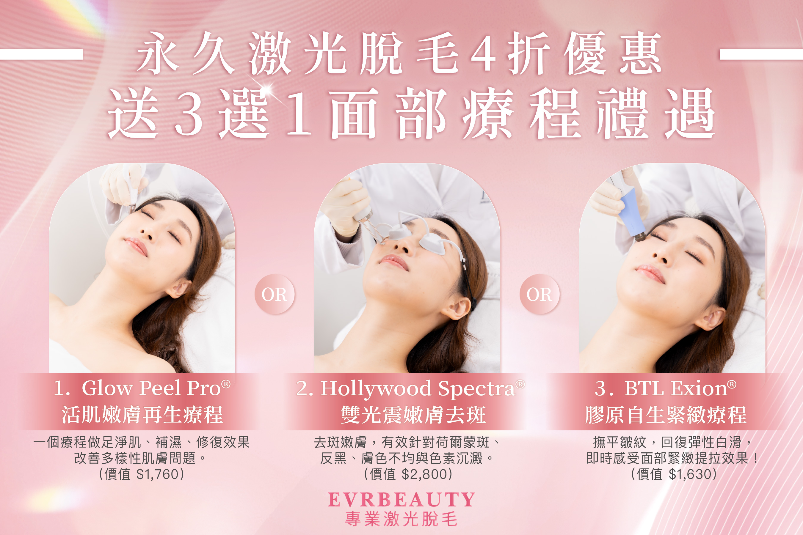 4折激光脫毛療程套餐 送 活肌嫩膚再生療程 / 雙光震嫩膚去斑 / 膠原自生緊緻療程 乙次