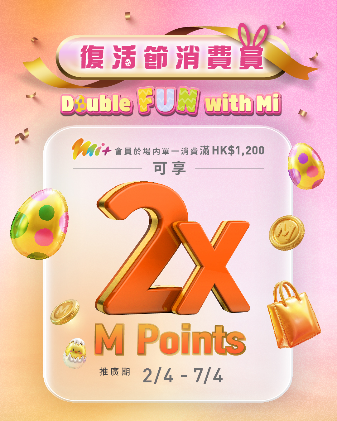 - 由2026年4月2日至2026年4月7日,登記成為Mi+新會員,於推廣期内上傳場內商戶電子消費滿 HK$1,200或以上的機印收據,可享雙倍積分,積分將自動存入會員之帳戶。