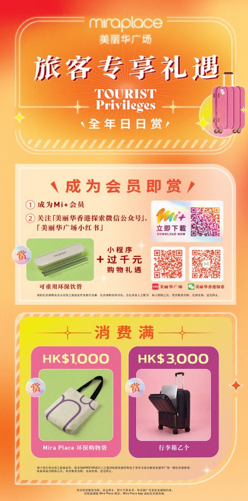 - 推廣期內,旅客於場內即日以電子貨幣消費滿HK$1,000(憑最多3組HK$100 或以上之電子消費收據)及出示有效之旅遊證件,即可獲贈Mira Place 環保購物袋乙個。